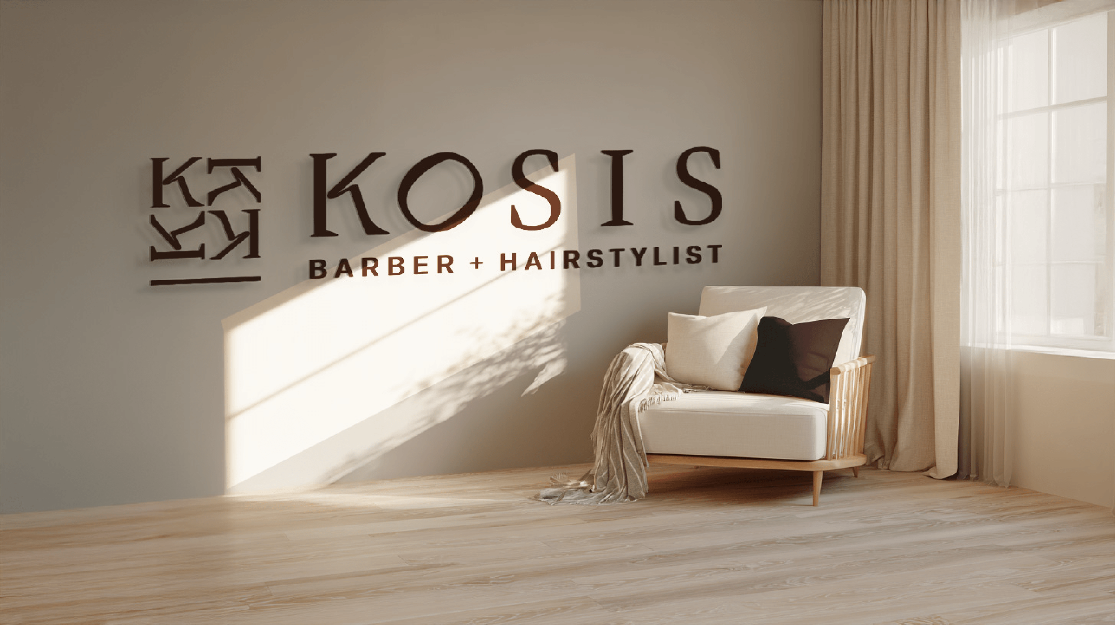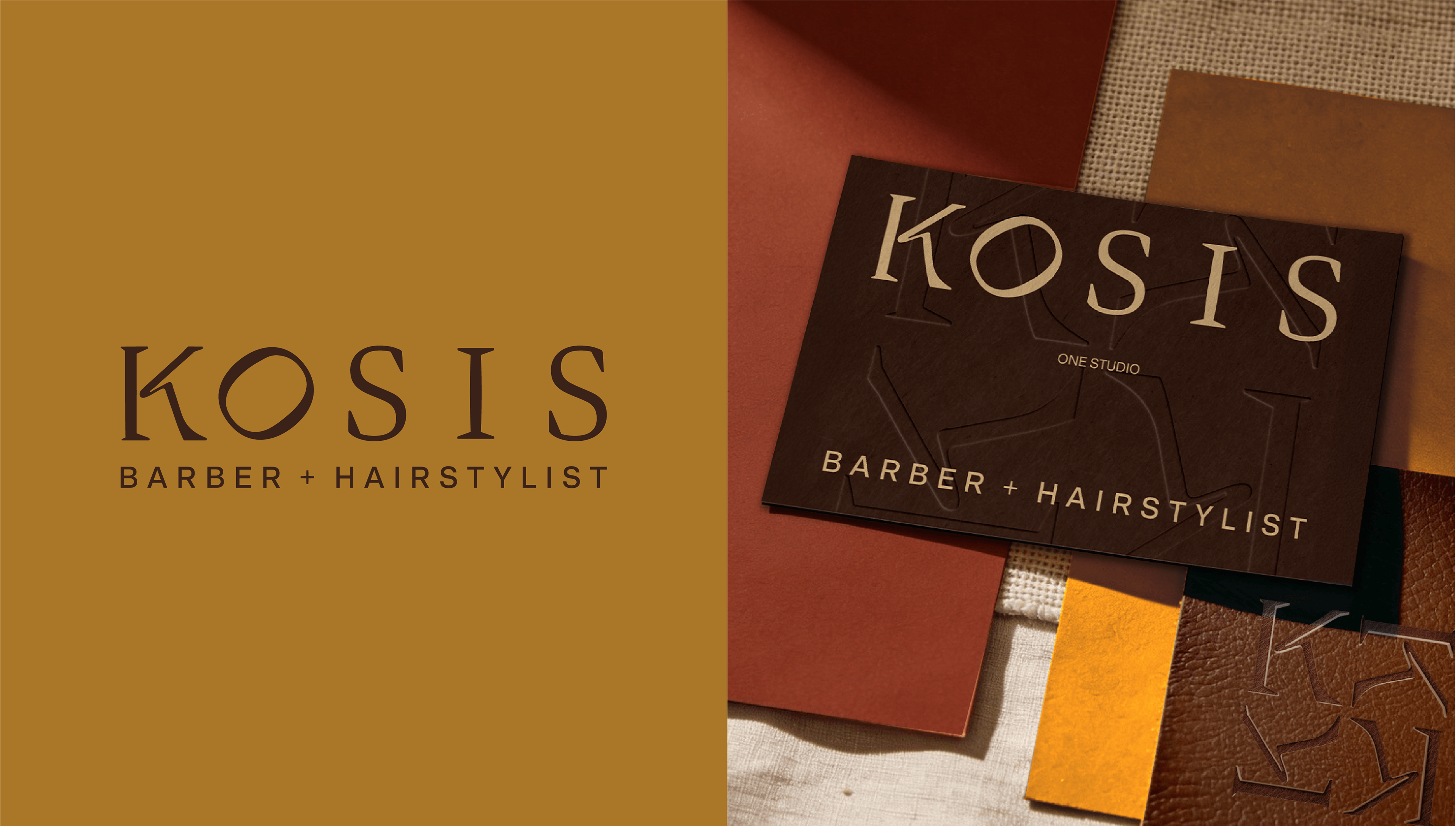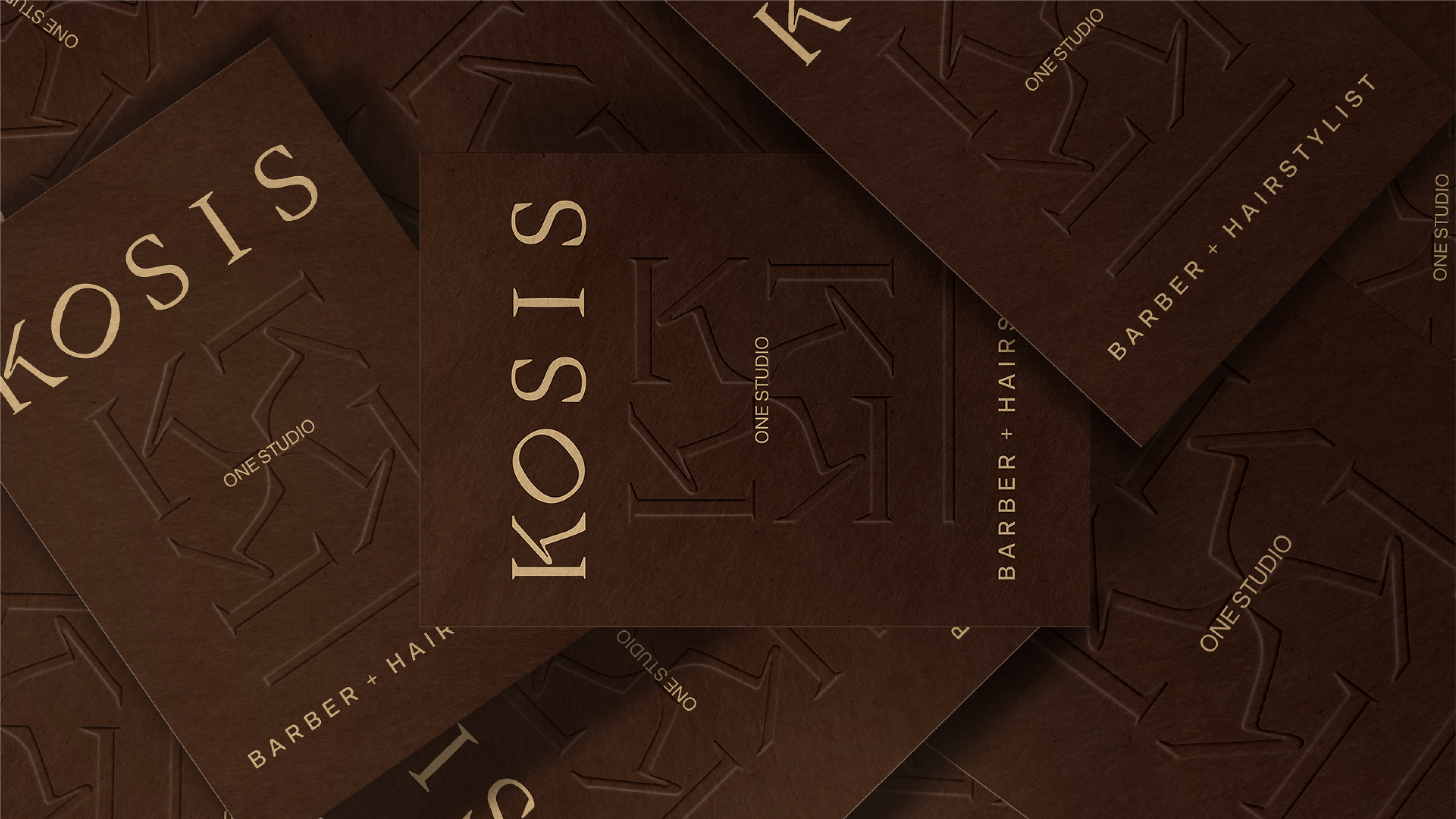 The KOSIS identity was created to represent the collaboration between a barber and a hairstylist in a shared studio. The logo combines a geometric monogram with refined typography to symbolise unity, precision, and craftsmanship, while a warm, premium colour palette reinforces a sophisticated and contemporary brand presence.